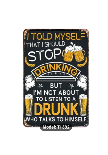 In conclusion, the "I TOLD MYSELF TO STOP DRINKING" sign is a humorous declaration of self-referential indulgence, employing absurdity and self-deprecation to elicit a reaction. Its vintage aesthetic, bold typography, illustrative elements, and comedic message all contribute to its appeal as a decorative object that evokes a sense of amusement and lighthearted revelry.